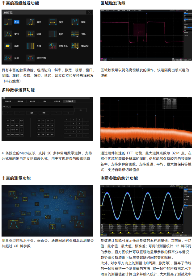 11、4 路独立的波形运算,支持 32M 点 FFT 和 20 多种常用时域运算;支持自定义表达式实现复杂的嵌套运算