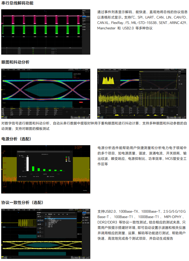 12、多种高级数据分析和处理功能:搜索和导航、高速模板测试、波形直方图、波特图、电源分析(选件)、计数器、眼图分析和抖动分析(选件)、多种协议一致性分析(选件)等