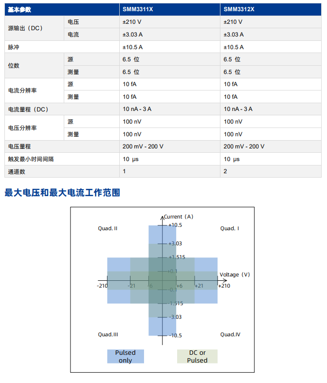 7、高达±210 V 直流电压、±3 A 直流电流/±10.5 A 脉冲