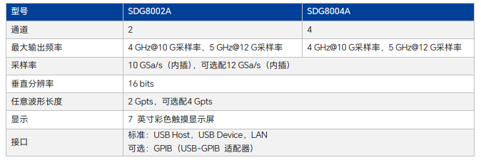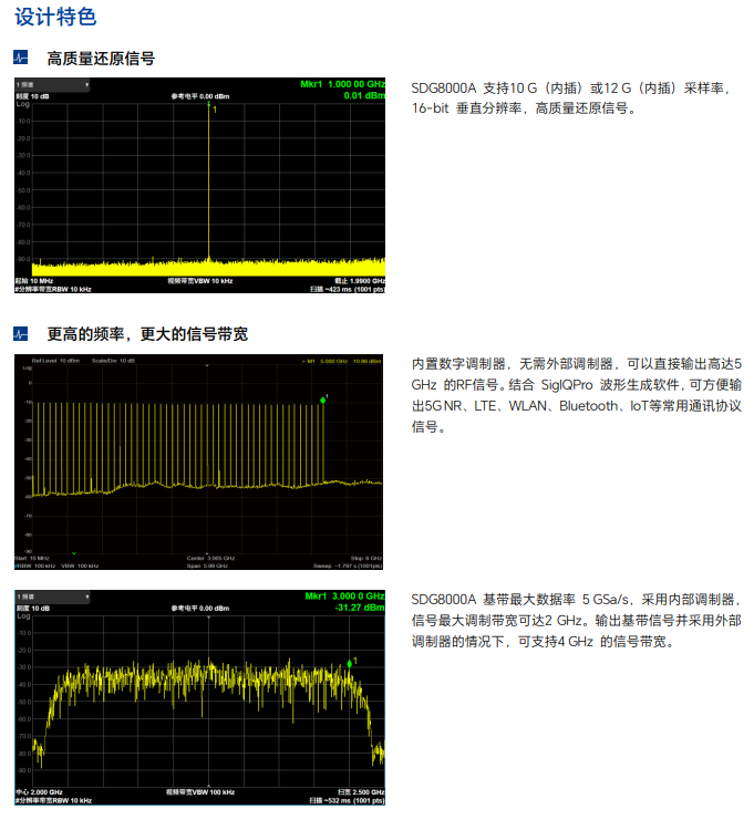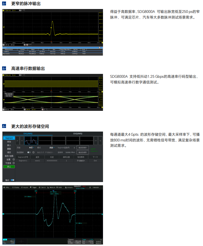 SDG8000A 系列函数 / 任意波形发生器,最大 4 个模拟输出通道,具备 16-bit 垂直分辨率,最高 12 GSa/s(内插)采样率,输出频率可达 5 GHz,最大调制带宽可达 2GHz。每通道最大 4G 样本点存储空间,无需牺牲信号带宽,提供更长的播放时间。配合SigIQPro 还可提供蓝牙、WIFI、LTE 等通讯信号波形输出。此外,SDG8000A 还提供高速串行码型信号输出,支持复杂的多层级序列波输出,双脉冲、多音以及线性调频的功能,满足通讯、工业和科研领域广泛的测试需求。