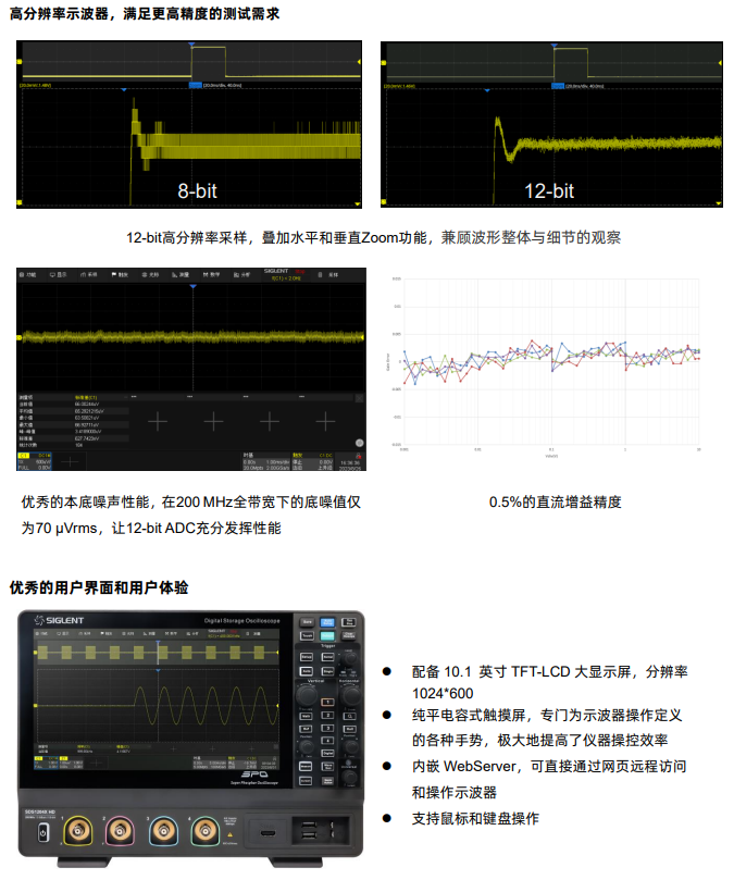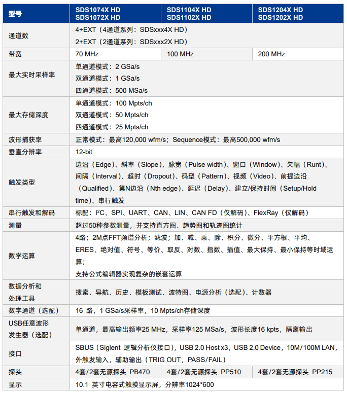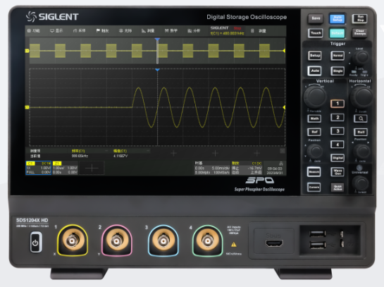 SDS1000X HD系列高分辨率数字示波器,具有最高12-bit垂直分辨率、优秀的本底噪声性能和垂直测量精度,能满足更高精度的测量需求。SDS1000X HD的最大带宽200 MHz,采样率最高2 GSa/s,具备2/4个模拟通道和16个数字通道,存储深度可达100 Mpts。SDS1000X HD采用的SPO技术,波形捕获率高达500,000帧/秒,具有256级辉度等级及色温显示;创新的数字触发系统,触发灵敏度高,触发抖动小;支持丰富的智能触发、串行总线触发和解码;支持历史(History)模式、分段采集(Sequence)、模板测试、搜索、导航、波特图和电源分析等高级分析模式;具备丰富的测量和数学运算功能。SDS1000X HD采用了10.1英寸电容式触摸屏,支持多种手势实现对波形和菜单的常用操作,结合前面板的多个一键操作按键,极大地优化了操作示波器的效率,提升了用户体验。