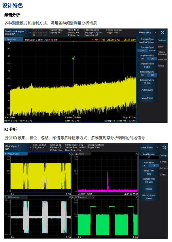 4、支持实时 IQ 分析,带宽最高至 1.2GHz,支持 IQ 信号的采集,存储和回放,以及瞬态分析,跳频分析等复杂 IQ 处理功能